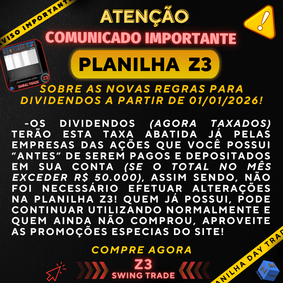 - As Planilhas possuem inúmeras células que contém Fórmulas e Cálculos imprescindíveis para seu funcionamento, as quais, se mesmo por engano forem alteradas tornariam estas parcialmente inoperantes ou apresentado erros, à vista disso, NÃO será liberada a Senha de proteção de tais Células para modificações, assim como para alterações no Layout, Controles e principalmente nos Cálculos pois todos seguem as regras da B3 e Receita Federal.